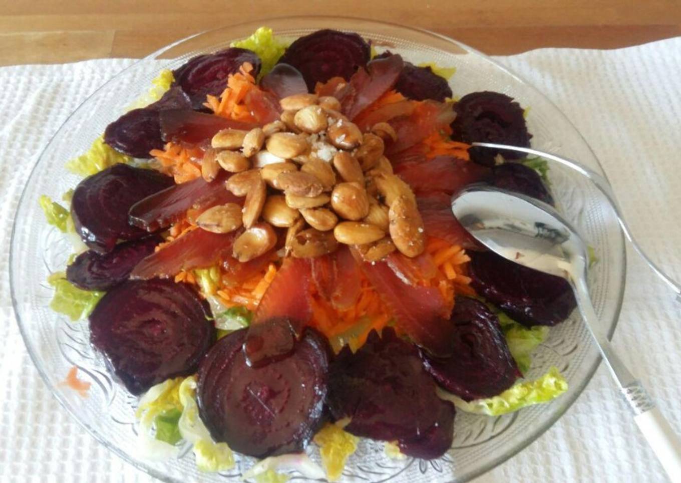 - En una fuente llana vamos poniendo los ingredientes en este orden: Primero la lechuga muy bien escurrida, después las remolachas, en medio la zanahoria rallada, después los filetes de mojama y por último las almendras fritas. Ponemos un hilo de aceite de oliva sobre todas las verduras y unas escamas de sal.