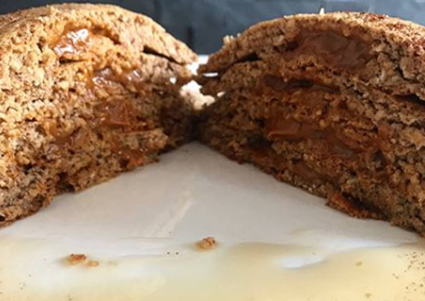 Son pancakes de avena, un clásico de siempre, pero los hice con un centro de arequipe. Lo acompañé con un capuccino con leche.