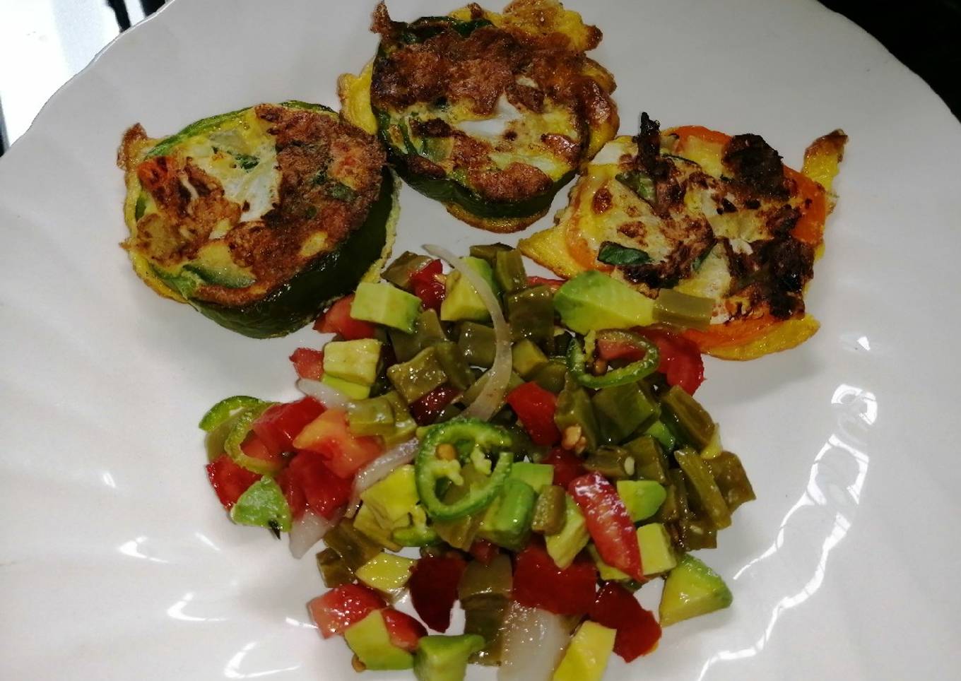 - Para los nopales, lavar y picar los nopales, calentar un sartén y agregar un poco de aceite y cocinar los nopales hasta que estén listos. Dejar enfriar y posteriormente pasar a un recipiente agregar el jitomate picado, aguacate, cebolla y chile serrano. Mezclar e incorporar sal y ajo en polvo. Y listo servir en un plato las rodajas de chile morrón y la ensalada de nopales.