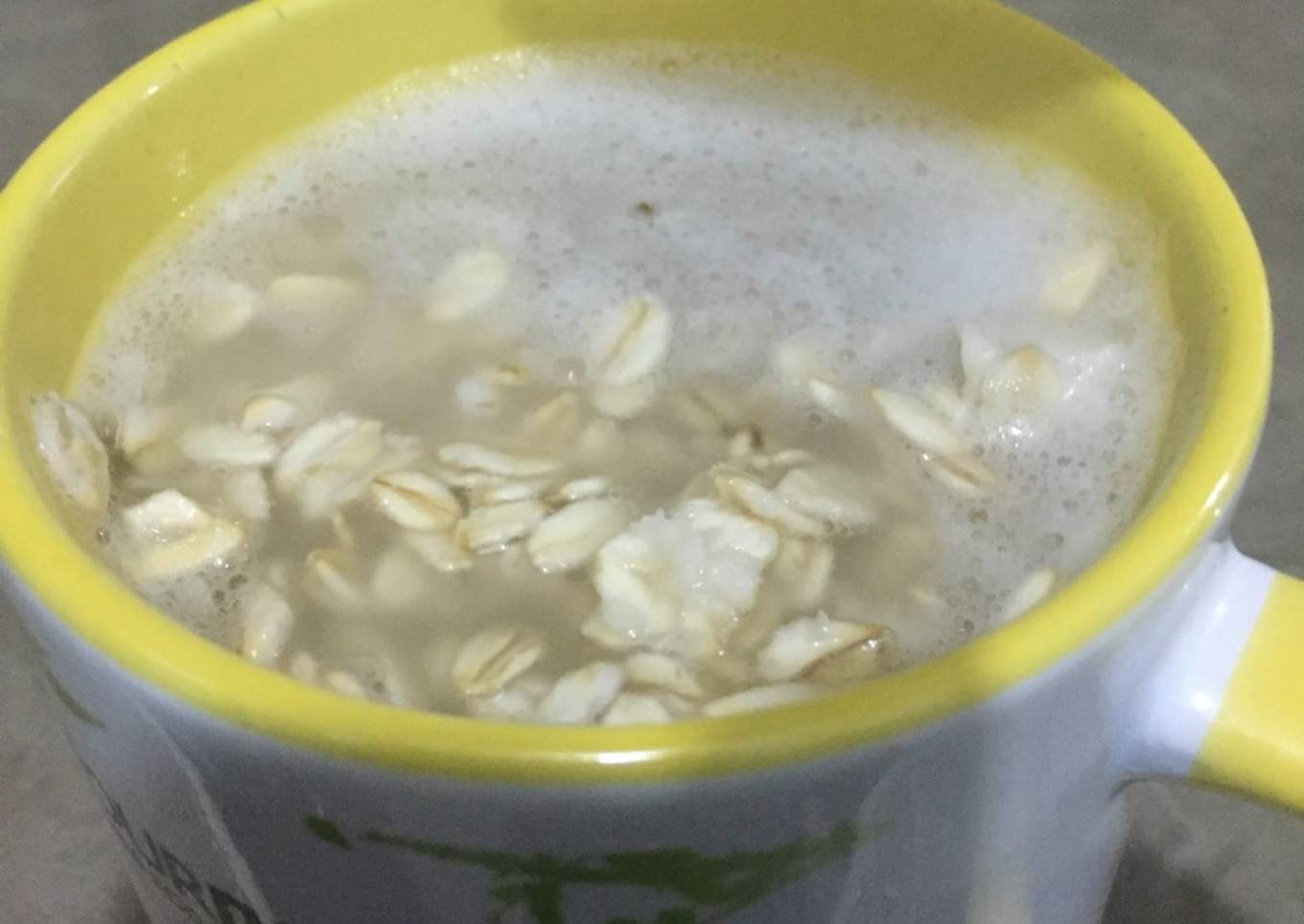 - En un recipiente resistente al calor coloca la 1/2 taza de avena y espera que el agua que pusiste al fuego se caliente, cuando se caliente agrégale el agua a la avena y déjala en remojo.