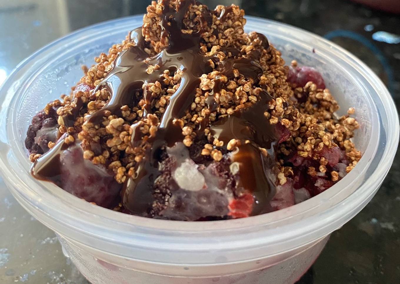 - Dejas 30 segundos la leche al fondo y después revuelves para obtener un “glaseado” la leche ayudará a que se comiencen a descongelar un poquito los berries y sea más fácil de comer. Agregas el amaranto, yo use de chocolate pero si tienes del natural también sabe rico 😋