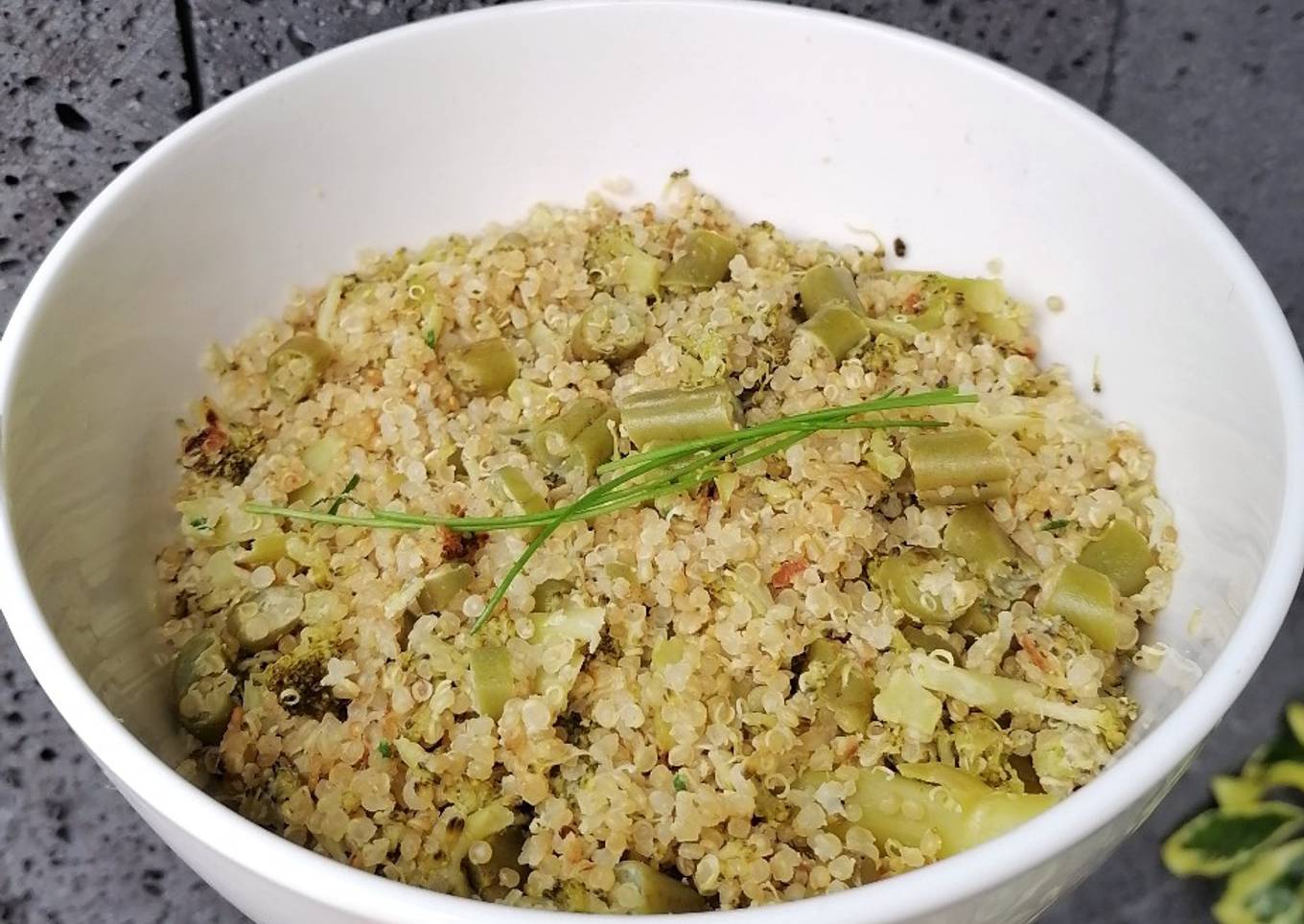 - En un bowl juntamos el br贸coli, los ejotes, la quinoa y los huevos batidos. Pasamos a un sart茅n grande con un chorrito de aceite y lo movemos para que se cocine parejo. Una vez que deja de estar h煤medo, est谩 listo.