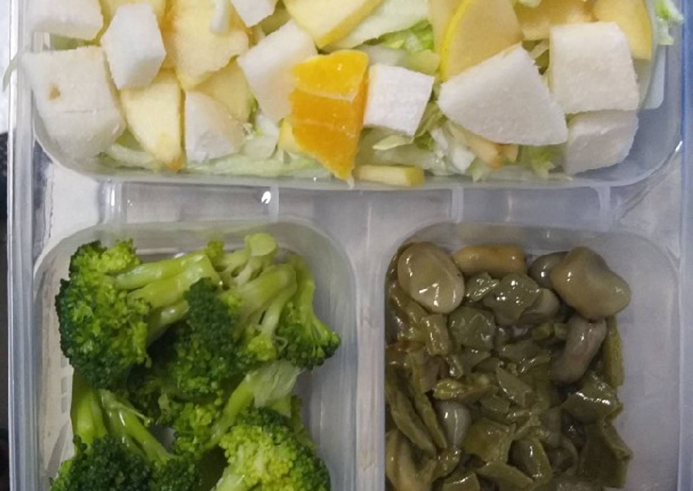 - Para la ensalada: lavar y cortar la lechuga en tiras, la jícama en cubos, la naranja en gajos y la manzana en cuadros pequeños, integrar y revolver