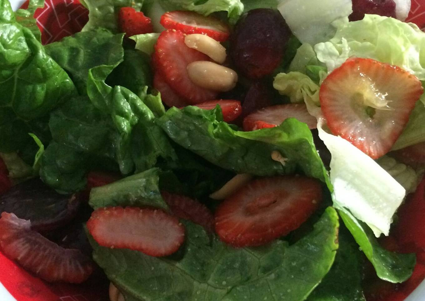 - Mezclar la lechuga con las fresas, uvas y agregar un chorrito de vinagre con una cucharada de azúcar y al final poner los cacahuates