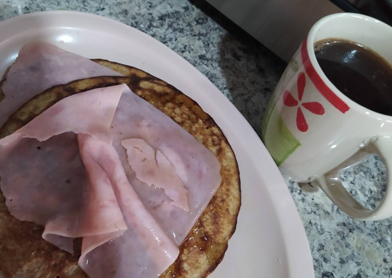 - Bañar con un poco de miel el hotcake y porner una rebanada de jamón en cada uno de los hot cakes.