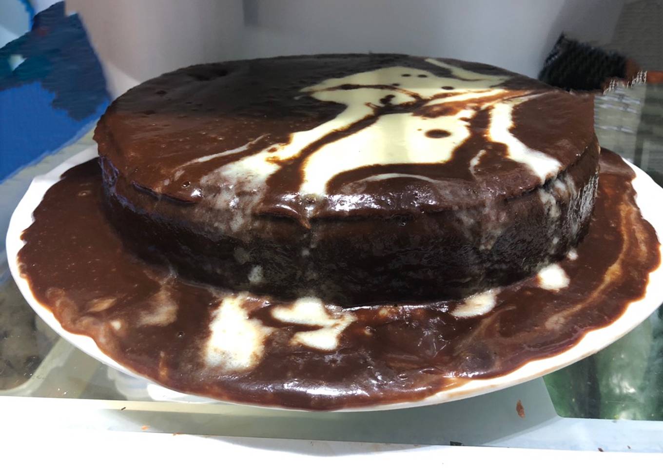 Glasear el pastel y mezclar con nata para que tome un sabor más ligero y dejar escurrir por los lados a cubrirlo totalmente - Mételo al refrigerador para que enfríe bien y no se escurra el glaseado