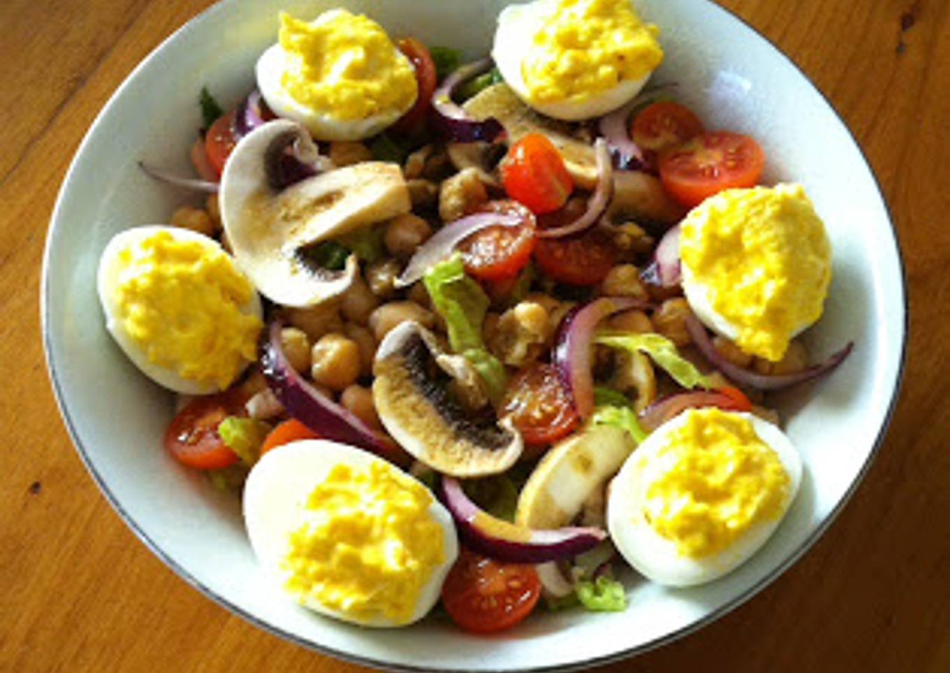 - Ponemos a cocer unos huevos a hacerlos duros, los pelamos, los partimos a la mitad, retiramos las yemas las mezclamos con dos cucharaditas de mayonesa y un poco de mostaza y volvemos a rellenar los huevos y con ellos adornamos la ensalada.