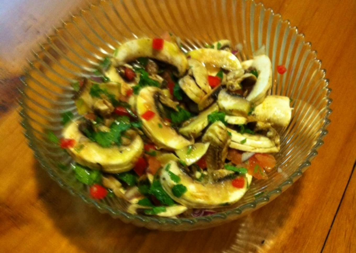 - En una ensaladera ponemos un jitomate pelado y picado, 3 champignons rebanados -en crudo-, 1 cucharada de cebolla roja picada, una ramita de cilantro picado y medio pimiento rojo picado, si quieren le pueden poner chiles en vinagre picados. Preparamos una vinagreta con 1 cucharada de vinagre, 1/2 cucharadita de consomé en polvo, ajo en polvo y pimienta en polvo y 3 cucharadas de aceite de oliva, la revolvemos muy bien y la repartimos en la ensalada.